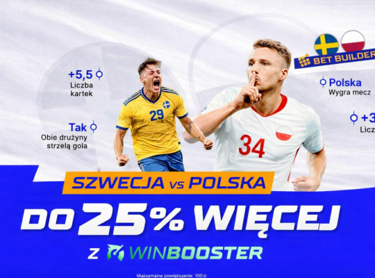 STS przygotował na to spotkanie Winbooster! Możecie zyskać +25% do wygranej jeśli na kuponie znajdzie się trafiony mecz Szwecja - Polska. Jeśli kupon jest zwycięski i zawiera ten mecz - dostajecie +25% więcej!